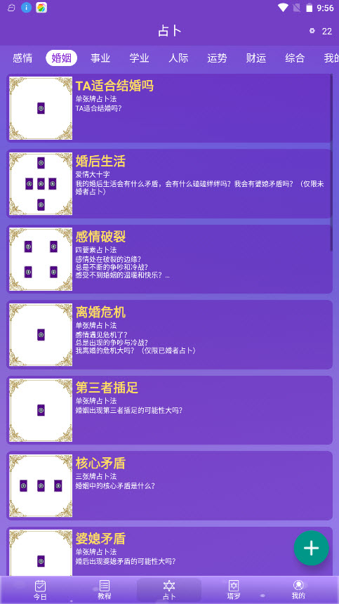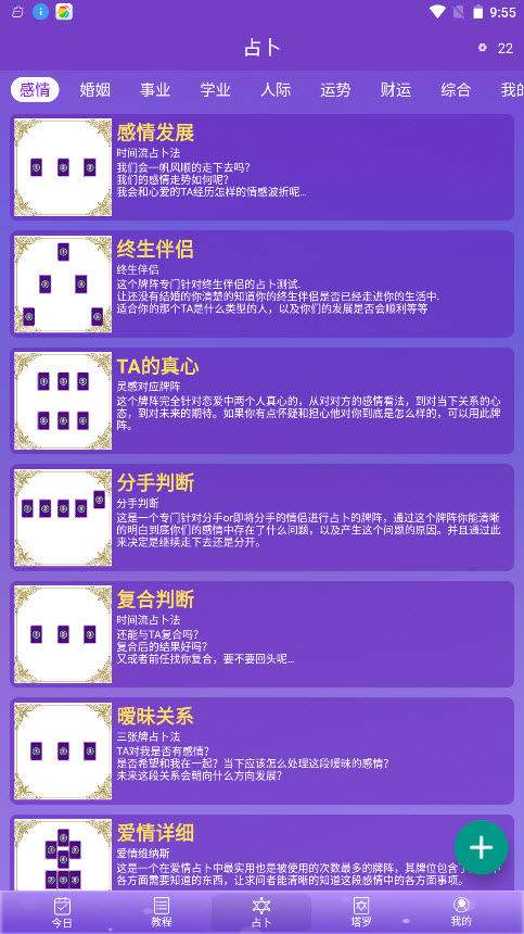 2,情感、婚姻、爱情、财运等拥有超多的细小分类为你提供占卜的,全程都是免费的,不需要花钱。