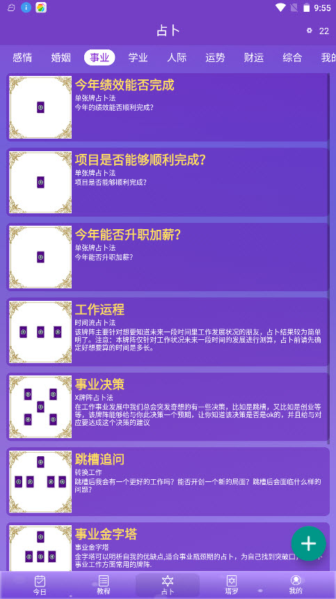 塔罗牌占卜app是一款能够预测自己运势的软件,平台中的占卜都是具有科学性的,本次提供的版本为高级版,用户能够免费的享受里面的占卜玩法,感情、事业、婚姻以及人际等方面的事项,在这个里面都能够为你精准的分析,无需登录也能够让你畅快的玩,每一个卡片的解释都是非常的详细,还能够收藏。