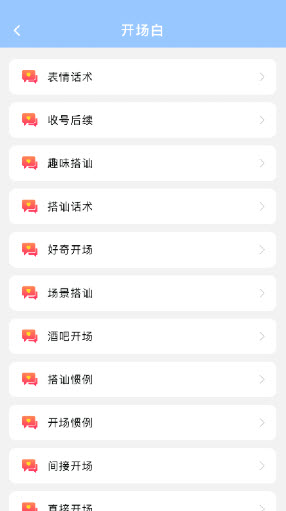 这个里面拥有丰富的恋爱和聊天技巧,用户在线上可以学习到超多的话术,在和陌生人聊天的时候再也不用担心自己会冷场,让你分分钟就能够成为情场感受,十八般武艺让你秒学会,无论是开场白还是话题,通过相关分类的搜索和筛选即可让你使用,情场干货,摆脱单身的命运那都不是事儿。