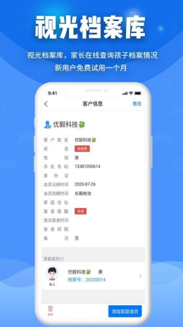 3.软件建立了完善的视光档案库功能,用户可以查询自己孩子的数据库,通过档案库可以让用户免费试用平台的综合服务,让用户更加方便的使用各种优质服务。