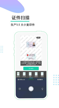 3、证件扫描,支持身份证、护照、驾驶证、营业执照等快速提取文字,拍照或相册选图没自动切边去除杂乱背景,生成高清扫描件。