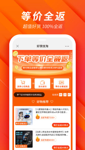 好货淘优app是款优选好物且优惠的购物平台,海量优质的商品在线上都是官方和商家精挑细选的,品种丰富,用户在线上能够找到很多自己喜欢的商品,等价全返,没有中间商在这里面赚差价的,都是直销的,价格更加的优惠,严格把控,绝对的保障,每一天都有不同的商品在这里面上架,感兴趣的话,可以来下载购买的。