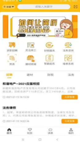 惠商无忧app是一款为所有企业用户提供包括企业注册以及代理记账以及财务咨询和商标注册的综合服务软件,软件中设计了非常全面的企业辅助功能,还可以通过强大的用户导入能力为用户提供优质的招聘渠道,为企业招募到超级优质的各种人才,提高企业的综合实力,满足企业发展的各种需求。