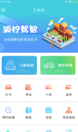 狐柠驾智app是一款非常优质的综合驾校管理系统软件,软件中通过大数据模式的开发设计,导入了驾校高速的智能管理模式,通过高速的信息联络和互传,让用户能够更加方便的管理驾校的各种事物,包括场地和驾校车辆的管理,还有仓库物品以及打卡学习以及考试强化,更好的为驾校学员服务。