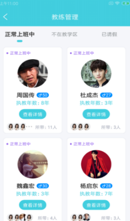 3.软件中对于所有的驾校教练都有着完善的管理机制,用户可以查看到自己教学区的所有教练,通过数据传递可以看到教练上班的情况,还有请假和不在教学区的教练,合理安排。