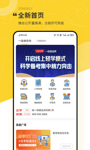 众学建造app是一款为建造师提供的学习平台,可为其提供最全面的建造考试资料,实景进行讲解,为每一个建造师提供最好的授课环境,高效的学习方式,让里面的试题可通过场景来表现出来,从而达到过目不忘的效果,所有的课程项目都是有包括的,业务广泛,知识串联,量身的私人定制。