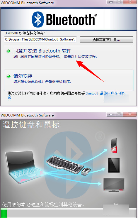 2、点击同意安装,程序开始运行,稍等一会,系统会提示没有检测到蓝牙设备,这个时候插入蓝牙适配器(一定要等到提示的时候再插入),系统自动识别,继续运行安装,直到完成。