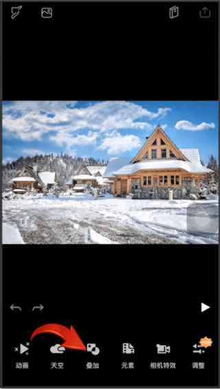 2、接着在相册中选择你要添加烟雾的图片,再点击底部的【叠加】选项