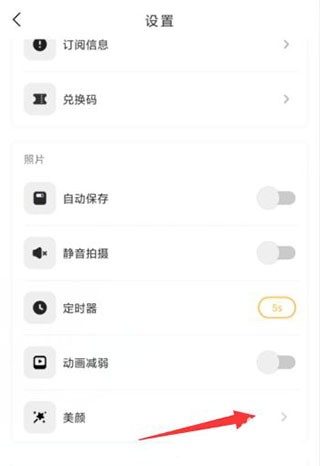 2、在设置页面,照片功能中点击【美颜】。(如图所示)