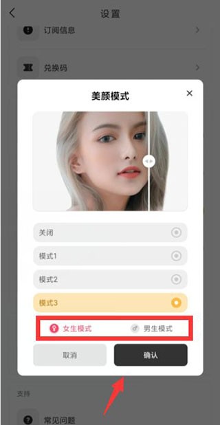 3、跳出窗口后,选择女生模式还是男生模式及美颜的模式,再点击【确认】即可开启。(如图所示)