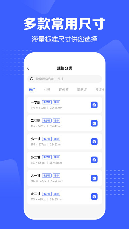 1. 内置丰富的尺寸库,覆盖各类证件照的标准尺寸,适应不同的用途场景。