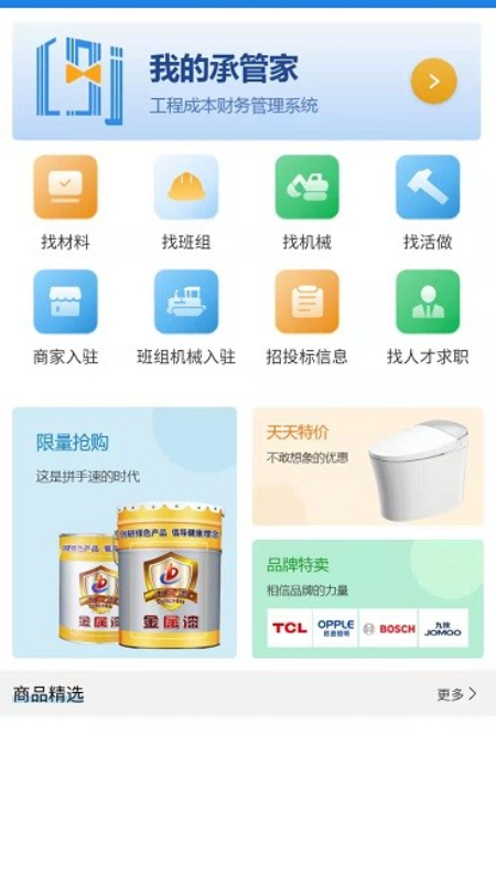 承包商管家app前身为~工程成本财务管理系统,使用这个系统的99%都工程总包。为工程总包提供一个可以复制的成本管理方案。服务网络已经覆盖全国大部分地区,承包商管家app是自带工程总包的app,拥有找劳务班组、找活做、找机械、找材料、找施工员、工程成本财务管理等功能。