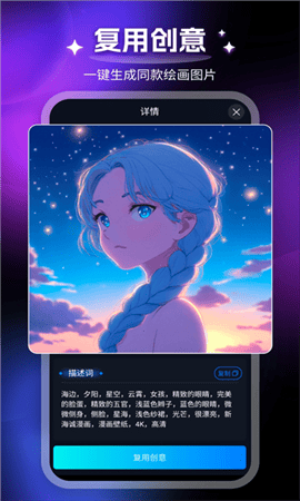 2、精准的生成用户内心的丰富世界,多种风格的艺术图片提供给用户。