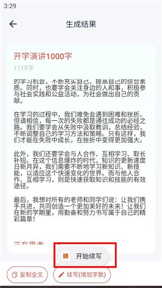 3、如果对内容不满意,也可以重新生成,或者直接选择续写,APP会在原内容上进行加工。