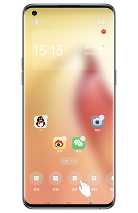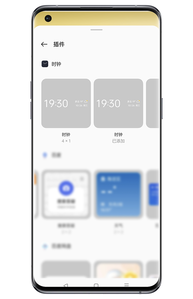 2、ColorOS 3.0-11.3系统版本:可双指放在屏幕斜对角,向内捏合进入桌面编辑界面,找到“(添加)插件”并点击,选择需要的“时钟插件”,点击添加即可。