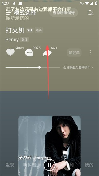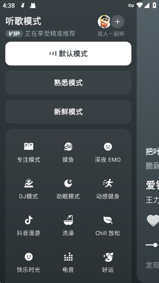 4、汽水音乐App也拥有自己的模式功能,可以在左上角进行切换,包含了默认模式、熟悉模式、新鲜模式等。