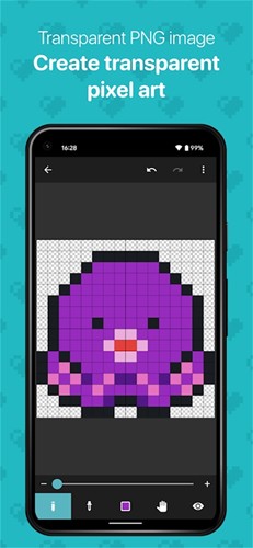 提供了多种画布尺寸选择、撤销和重做功能、滴管工具、画布预览、超过30个工作数据、96色的标准调色板以及24种用户自定义调色板等丰富的操作工具。