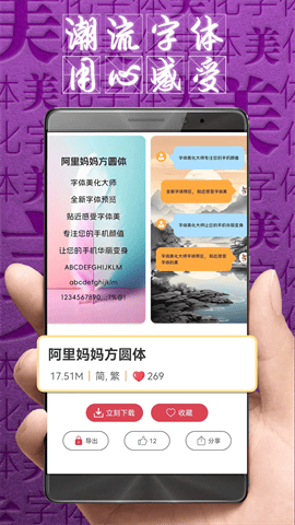 字体美化大师免费版软件是一款可以美化手机字体的软件,用户可以丰富自己的手机样式,而且有海量的字体都可以免费的下载,帮助用户来给自己的手机切换多个字体风格,包括炫彩的、正楷体、华康少女体、叶根友字体、华文琥珀等等,换个字体换个心情,有需要的用户可以随时下载使用。