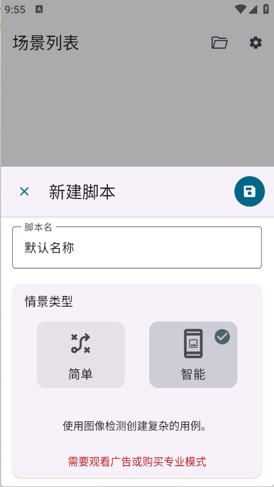 4、选择好情景类型后,为脚本设置一个名称,然后点击右上角的“保存”按钮。