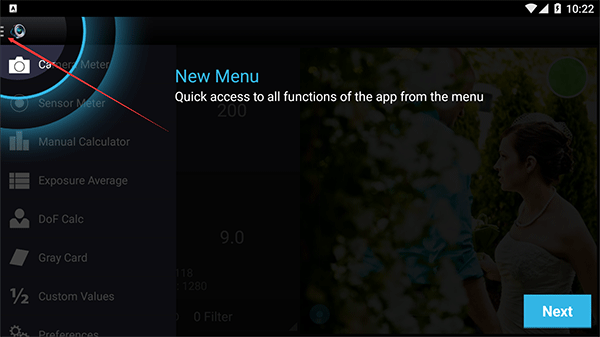 1、打开lightmeter,点击左上角的按钮可以唤出菜单栏,快速访问应用程序的所有功能;