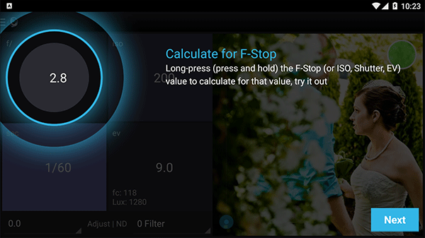 4、长按(按住)F-Stop(或ISO、Shutter、EV)值以计算该值,然后试用;