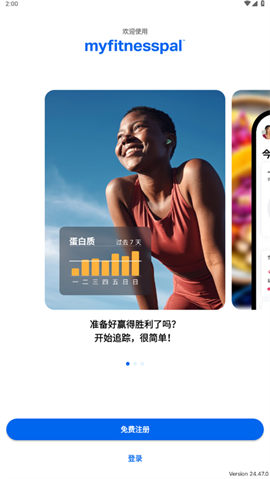 1、下载并打开MyFitnessPal后,如果没有账号则点击注册按钮。