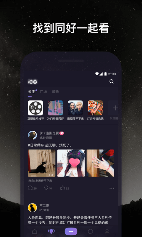 2.广场区,让你发现更有意思的人与兴趣相投的人,关注自己想要了解的人。