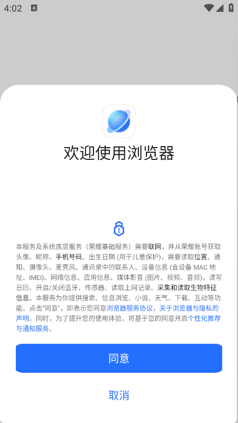 1、新用户首次进入荣耀浏览器,会提示获取权限之类,点击同意即可;