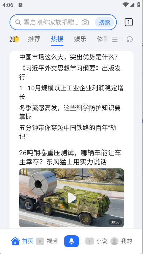 2、进入app,首页可以看到推荐、热搜、娱乐、体育、直播、国际、军事和科技等板块,可以修改板块;