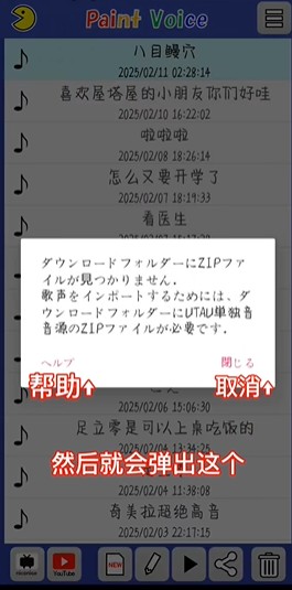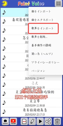 (1) 从 PaintVoice 应用程序主屏幕的菜单中执行导入歌声。