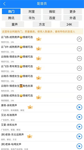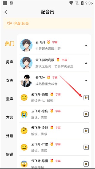 2、选择配音员,点播放键只是试听该配音员音色,需要点击配音员名称部分才可以选中该配音员。