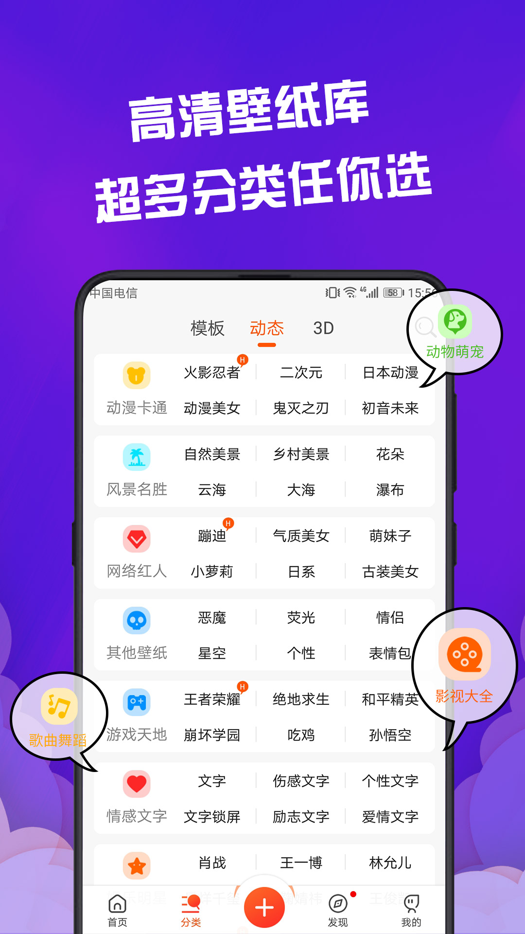【海量资源】娱乐明星、网络红人、动漫卡通、影视大全、动物萌宠等多种动态壁纸资源任你选;