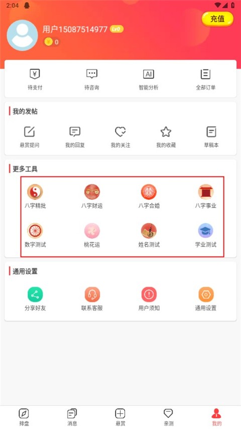 4、软件还为用户提供了财运、桃花运、姓名测试、学业测试等多种测试工具,有需要的用户可以自行选择测试。
