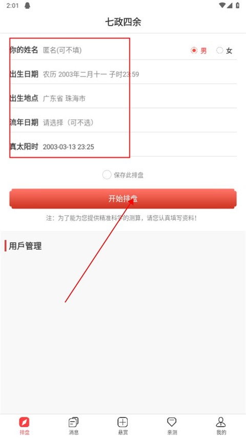 1、在本站下载安装并打开七政四余排盘APP,进入软件,是首先用户需要登陆,然后在首页填写自己的相关信息然后点击开始排盘。