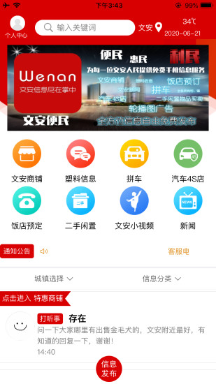 文安商铺、饭店预定、二手闲置、文安小视频、新闻等内容及时发布