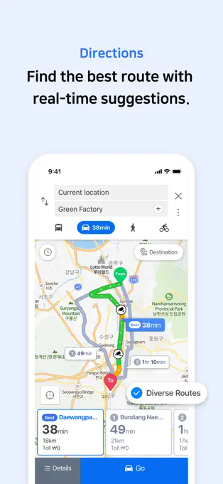 NAVER地图安卓版是一款专为韩国地区设计的地图导航软件,各类设施、公共交通的位置都有着清晰的介绍,周边的商场、餐厅等都可以轻松找到,旨在为用户的出行带来更多便利。一键即可切换中文版本,只需要在搜索框中输入内容,即可精准检索目标地点,简洁友好的界面设计,操作十分便捷。极为准确的导航功能,能够根据实时交通信息,自动选择最优路线。