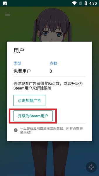 2、在这里可以点击看广告获取点数,或者升级为steam用户免费使用