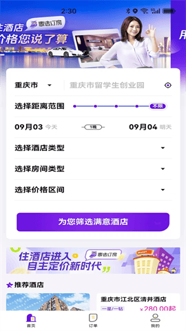 惠选订房app软件使用一款价格可以自己说了算的惠民订房住宿软件,在这里用户可以输入自己的需求,比如去哪里、几星级、房间类型以及价格区间,能够自己修改价格,等待订单发布之后,酒店接单之后,可以出现二维码,到酒店去核销就可以办理入住了。