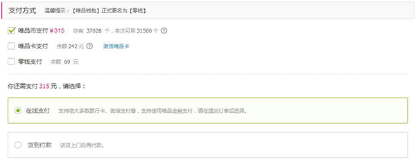 使用方法:在订单确认页-支付方式栏,可勾选“唯品币支付”,即可减免相应付款金额,订单余款可通过在线支付完成支付,具体如下图: