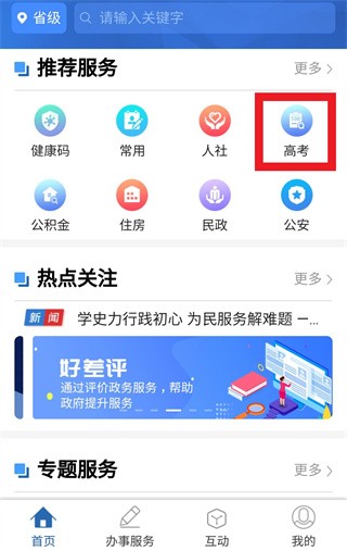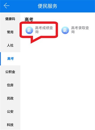 第三步:点击“高考”,选择“高考成绩查询”,然后输入考生相关身份信息后即可查询。