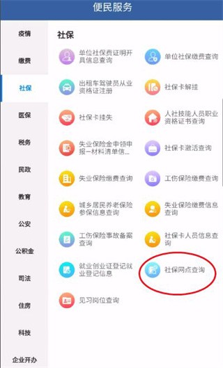 进入便民服务找到社保点击进入,然后进入社保网点查询;
