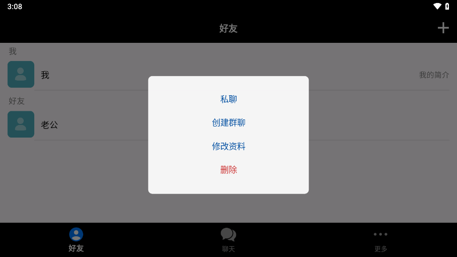 5、点击闺蜜,有私聊,创建群聊,点击私聊来模拟对话;