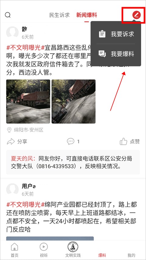 3、在“爆料”页面可以用看到其他用户发布的诉求和爆料信息,其中“待办结”表示正在等待处理,“已办结”表示处理完成,我们点击右上角的按钮,在下拉列表中选择“我要诉求”;