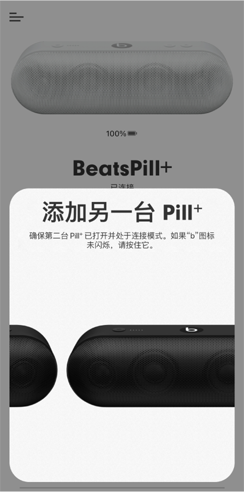 1、在设备屏幕中,电池电量显示在头戴式耳机、入耳式耳机或 Pill+ 扬声器图像的下方。