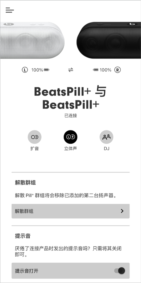 使用 Beats App 创建包含两台 Pill+ 扬声器的立体声群组,一台充当左声道,一台充当右声道。