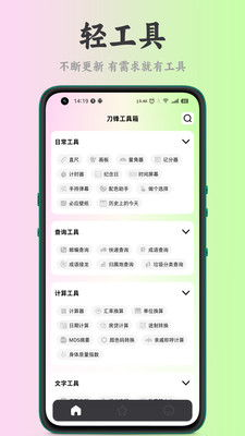 刀锋工具箱软件是一款多功能的手机工具软件,涵盖了日常、查询、计算、文字、图片、设备、文件管理等等日常生活的工具,一个软件即可解决自己的多个不同的需求,一站式解决自己的问题,而且适用于不同的用户,从学生到职场人都可以轻松的使用,满足不同用户的不同使用需求,有需要的用户可以随时下载使用。