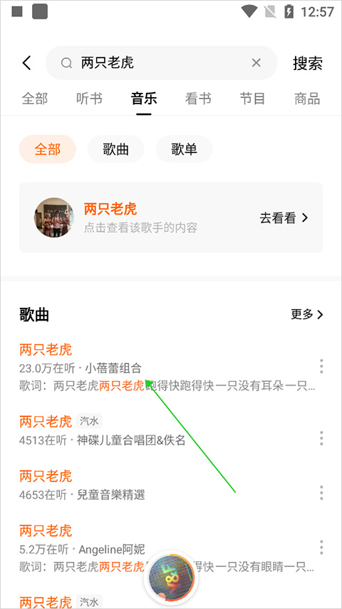1、用户可以打开并登录番茄畅听app后进入首页的音乐栏目中通过点击顶部搜索框(下图绿色箭头所指)