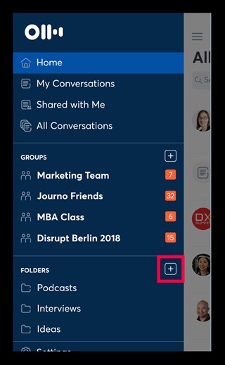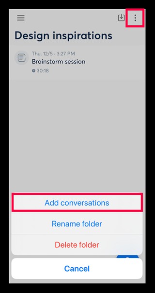 在文件夹屏幕上,点击右上角的图标以显示“添加对话”菜单。 当你点击它时,将显示记录的数据列表,因此请选择要分类到文件夹中的数据。