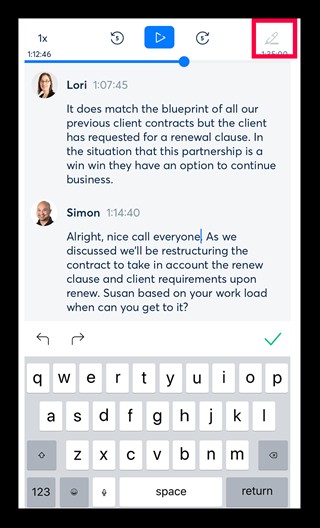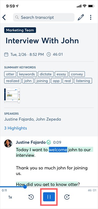 点击屏幕底部中央的图标以播放记录的数据并突出显示你正在阅读的单词,你还可以通过点击要播放的单词从任何点开始播放。
