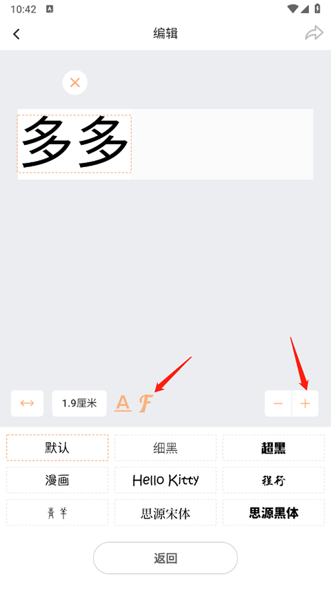 2、点击确定后内容就会出现在上方,这时你可以点击右下角+号来切换字体的大小,如果想切换字体样式可以点击F按钮